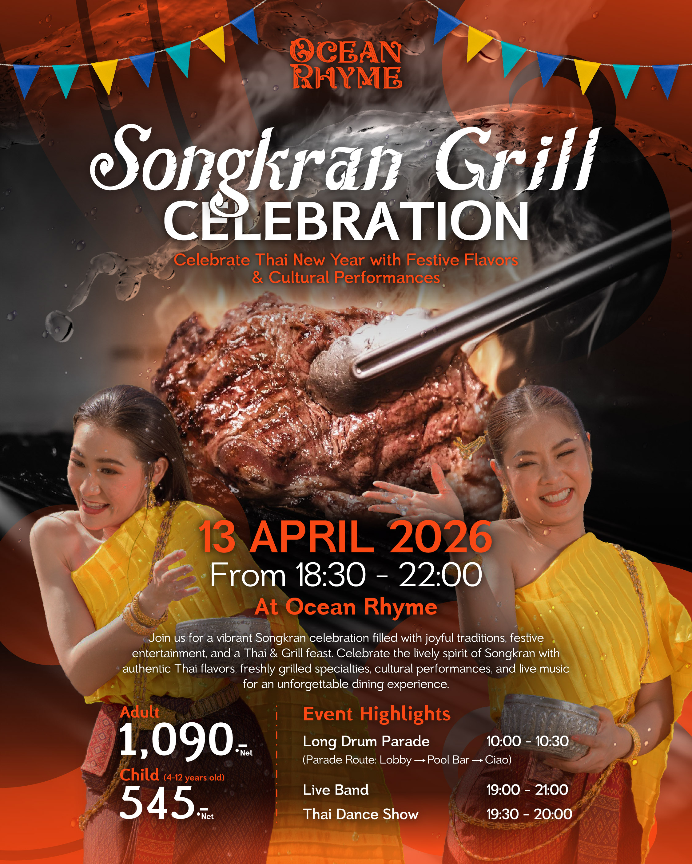 Immerse yourself in the joyful spirit of Songkran with live entertainment, cultural performances, and a lively atmosphere, creating a truly unforgettable evening by Ocean Rhyme.